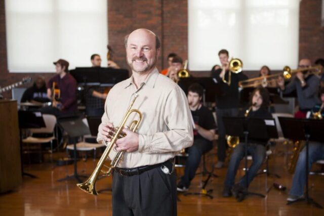 Dr. Joseph Lill, a professional trumpet player, conducts the Jazz Ensemble and Concert Band and supervises the instrumental music education program. “For an incoming music major, the advantage of a smaller school is that you get all the opportunities. You get to be in an orchestra if you’re good enough to make our orchestra. Concert band, jazz ensemble—you have places to perform, places to be involved,” he says.